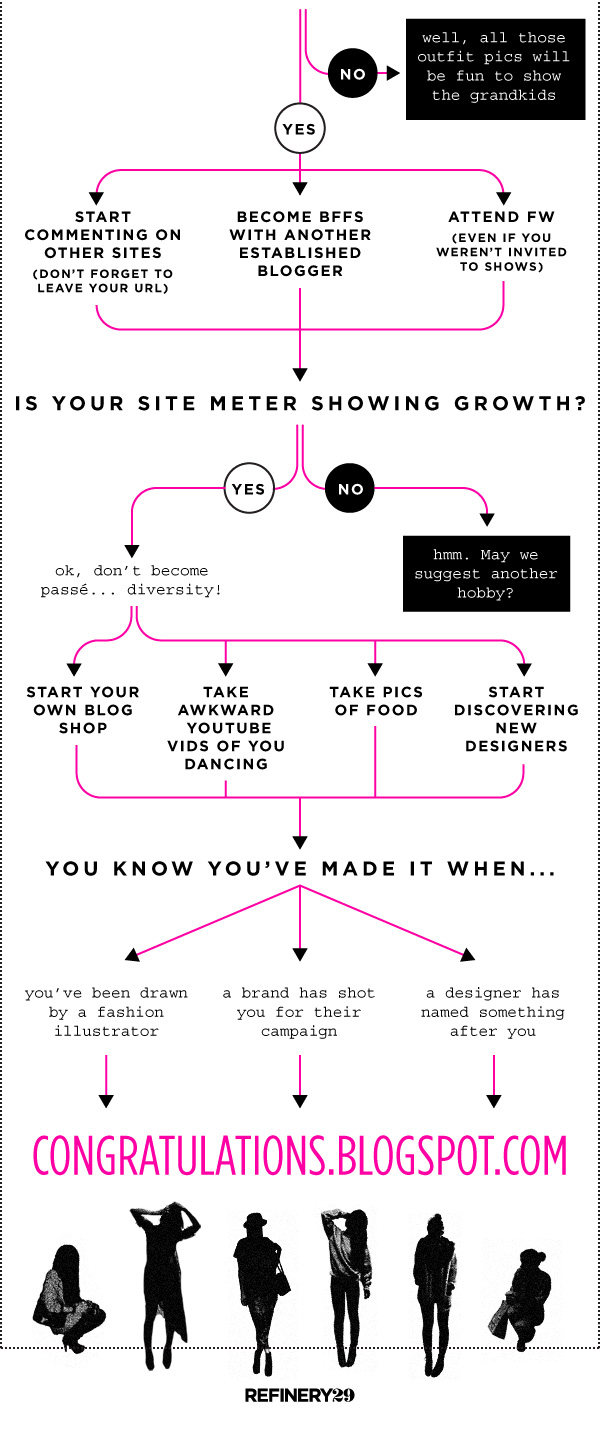 Refinery 29's satirical "How To Become A Star Style Blogger" flow chart is hysterical. Perfect timing for the beginning of my blogging adventure-although I plan on not taking the advice too literally. Who wants to be like everybody else? I am hoping to add some individuality to Spandex and Sparkles and really make it stand out among other blogs-bare with me while I figure out how!